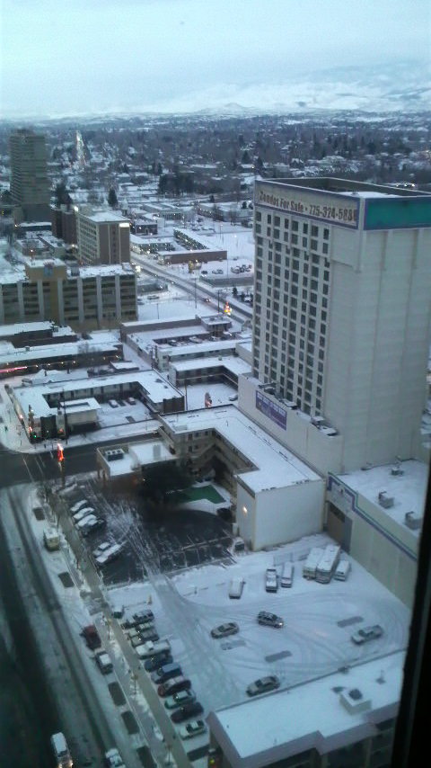 IJTが始まりました、今年もたくさんの来場者だと思います。でも 今私はアメリカ ネバダ州のリノという街にいます。毎年ラスベガスジュエリーショーに出展してるのはご存知だと思いますが、そこで 取り引きが始まった、お客様からのリクエストで こちらのショーに出品です。 なんとこちらは雪!北海道並み!こちらでは 色々なジャンルのショー 見本市があり 今回は宝飾品とは関係ない趣味の世界が集まっています。しかしパルティーナは 宝飾のカテゴリーだけに収まらないジュエリーなので お客様のリクエストに応えたのですが、さてさて結果が楽しみです。また新たな場所で日の丸を掲げてみます。。。今回初めての経験がありました。サンフランシスコで乗り継ぎした小さめのジェット機、いつものように出発遅れ!その上搭乗後、重量オーバーで 四人のボランティアが降りて やっと出発、噂では聞いた事あるけど、本当にあるんですね、! 皆デカ過ぎるんだよー! と窓の外を眺めな