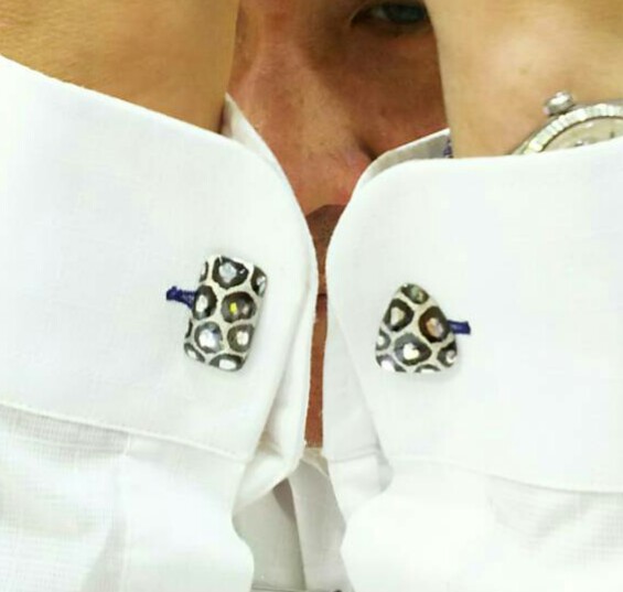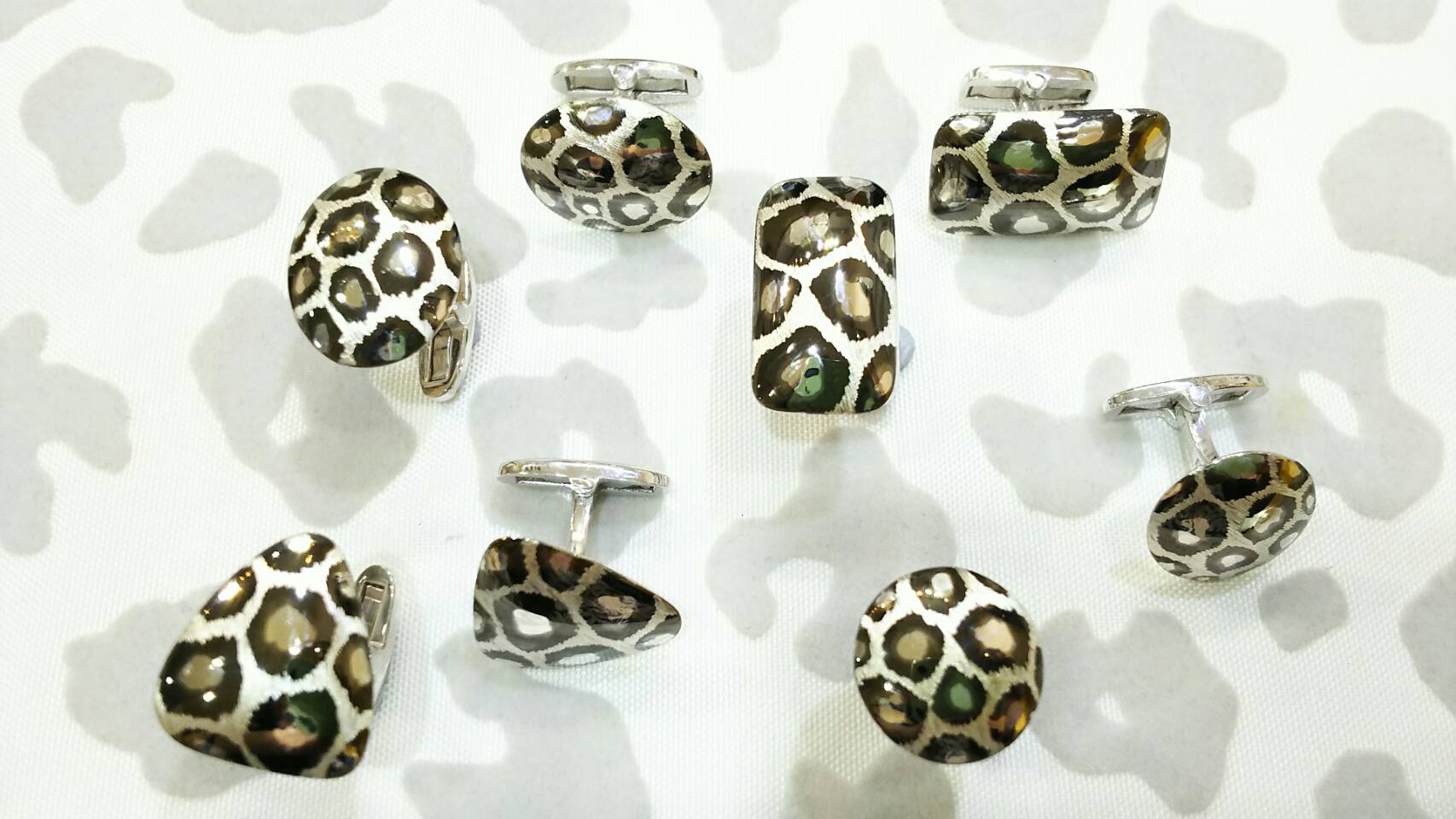 ヒョウ柄カフスボタンが完成しました。今回の作品は 立体感にあふれる 4種類のシルバー 雪ヒョウバージョン!K18コールドはオーダーになります。