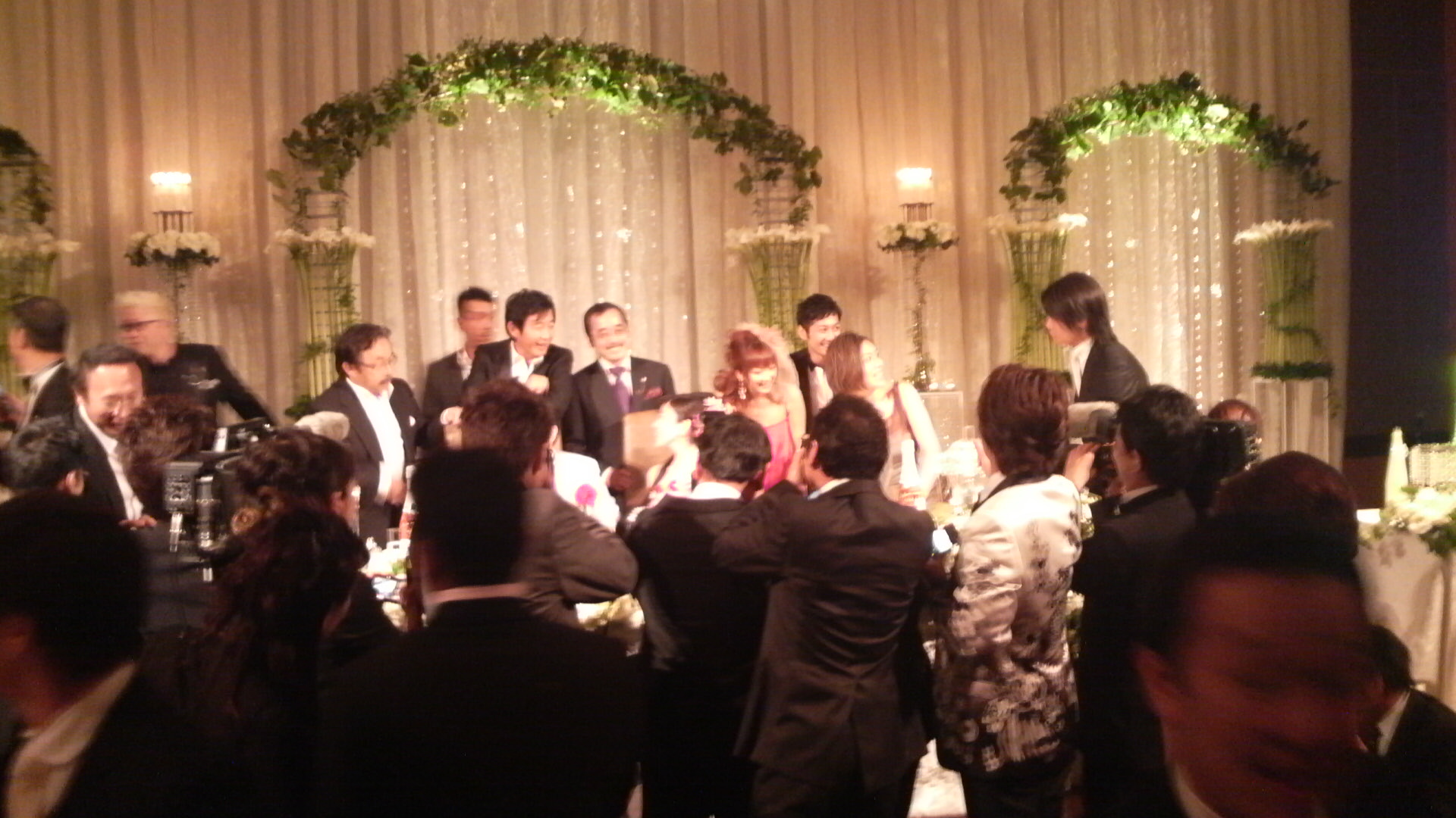 雛壇の上には記念写真の輪。下には招待客がカメラマン!。。。。。。。。。。。。。。。。 料理は あれだけ 続けざまにでると おいしさに麻痺するくらい!。 驚くのが ウニのパスタ、 ウニが寿司ネタレベル以上にで美味しかったのは普通でに考えられるが 350食がアルデンテとは どういうこと? トータル8人のシェフが替わり交代に出入りしている厨房は? いくら下準備しいても 戦争状態? 披露宴準備時間にエレベーターで新郎以外の7人と一緒になったが 僕もジュエリーの準備でテンション高かったけど、それを吹き飛ばすような雰囲気! さすがに迫力あるねー!同じ白衣でも 医者に囲まれる恐怖とは 大違い! 七人の侍料理人バージョン!格好いーー! 冗談言ったりしてるが 戦い前の 雰囲気。 今後も 一生経験する事はないような すごい披露宴だった 。 あまりに、素晴らしい経験、体験なので、これから 更新していきます。 画像は 大きいので表示していませんが 画像をクリックしてみてください。 では つづく PR