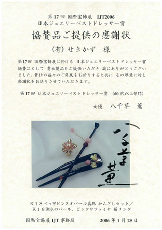 × [PR]上記の広告は3ヶ月以上新規記事投稿のないブログに表示されています。新しい記事を書く事で広告が消えます。 判らないまま番組を見たんだけど、凄いね~~~~! 深夜枠の番組じゃないよ! 凄いつくりだね~~~! リングも良く出来ている。 その後、それで何を求めているかがやっとわかった。「牙狼プロジェクト」の歌う主題歌の時に出演者のカオルがそのリングをペンダントとしても使いたいと言う事だったんですね~~~! ちょうど、良い物があったんですよ~~~!。「薄桜記」の頃から作っている「しだれ桜」のペンダント。これの裏側を細工しなおせばバッチリいけるジャン!、京様からの若き出演者達にプレゼントだからピンクサファイアてわけにはいかないから・・・ WGで センターもダイヤに変えちゃエ~~~!。 彼女にとって FIRST DIAMOND だったみたいです。 時間きつかったけど間に合って喜んでもらって、京様の気持ちが伝わってよかった~~! どうもその「牙狼プロジェクト」のポスターにも着けて出ているらしく、秋葉原を歩いてみたが「萌え~~!」のお嬢ちゃん達はたくさん見つかるんだけどどこに行けばポスター見れるの~~~?(笑) この「しだれ桜」は、ゴールドで作る前のシルバーバージョンは「せきかずSHOP」の方に掲載してますから見てくださいね。 PR